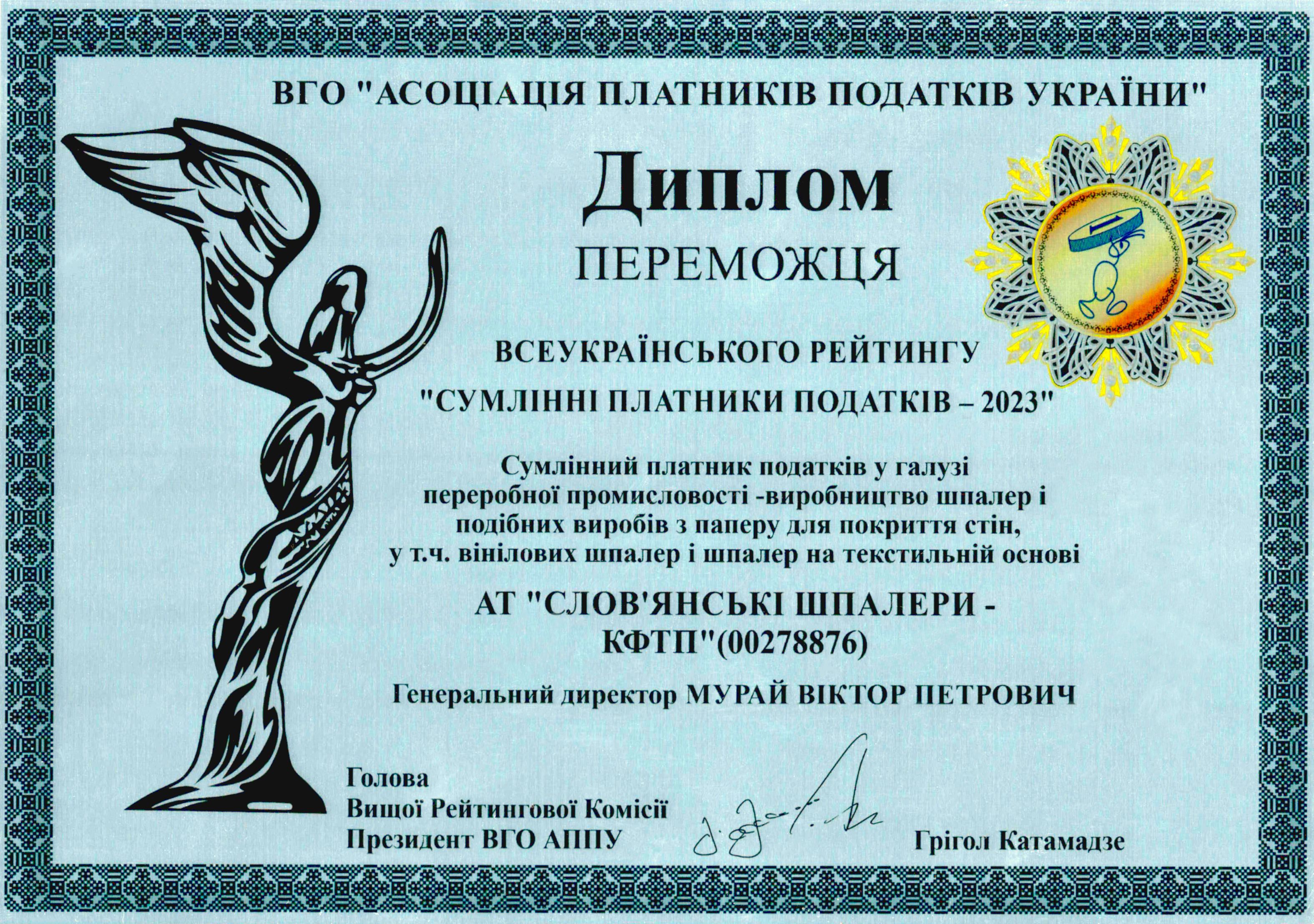 АО "Славянские Обои - КФТП" - победитель всеукраинского рейтинга "Добросовестные налогоплательщики - 2023"